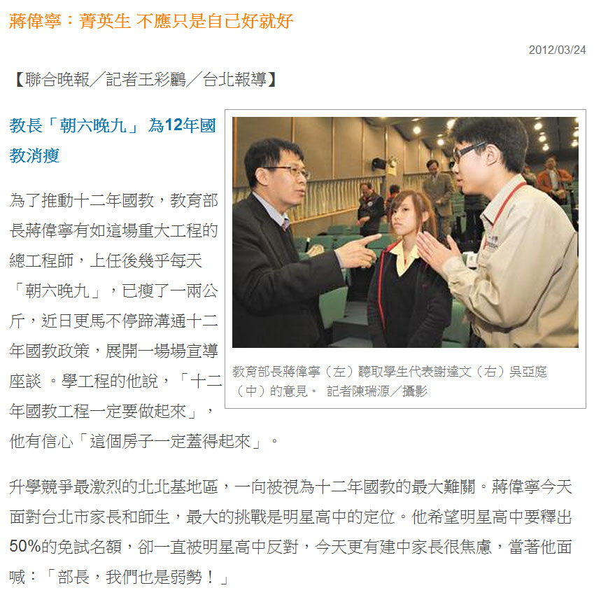 教育 十二年國教等於消滅明星高中嗎? koo 2012 年 03 月 24 日 “菁英生,不應只是自己好就好”-簡單的一句話就創造了虛擬的社會階級。 因為這一小撮人只為了自己好而妨礙了地球進步,只要這些人消滅了,十二年國教自然就水到渠成了!真的是這樣嗎? 只想請問蔣偉寧部長-花了多少億去培養明星大學,現在又花那麼心力去消滅明星高中。這中間的邏輯會不會太莫測高深了? 想了一下,大概我們只需要世界級的大學而不需要世界級的高中。一切都是時間*的錯吧! *泰晤士